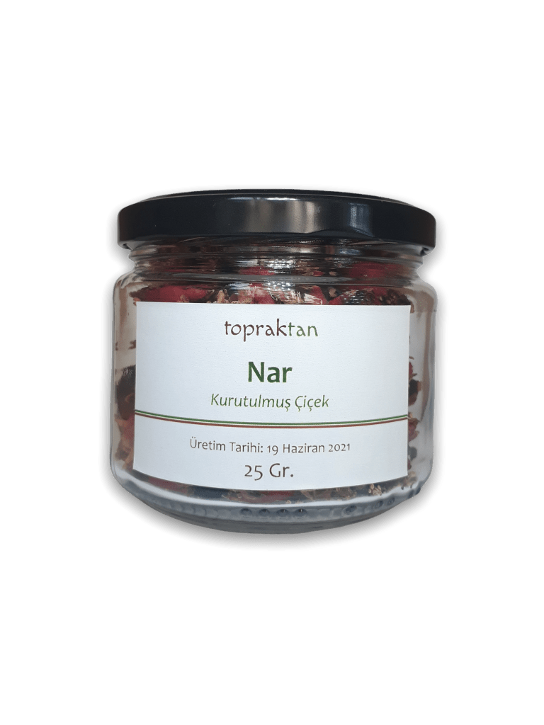 Narın faydalarını burada uzun uzun anlatmaya gerek yok. Nar ağacı çok fazla çiçek döker. Bu yüzden çiçek seyreltme işlemi yapılarak daha sağlıklı meyve almaya çalışır çiftçi. Biz de bahçemizdeki 3 nar ağacının çiçeklerinin %70’ini tazeyken toplayıp gölgede kuruttuk. 330 ml’lik kavanozlara doldurduk. Her kavanoz 25 – 30 gr kurutulmuş nar çiçeği alıyor.